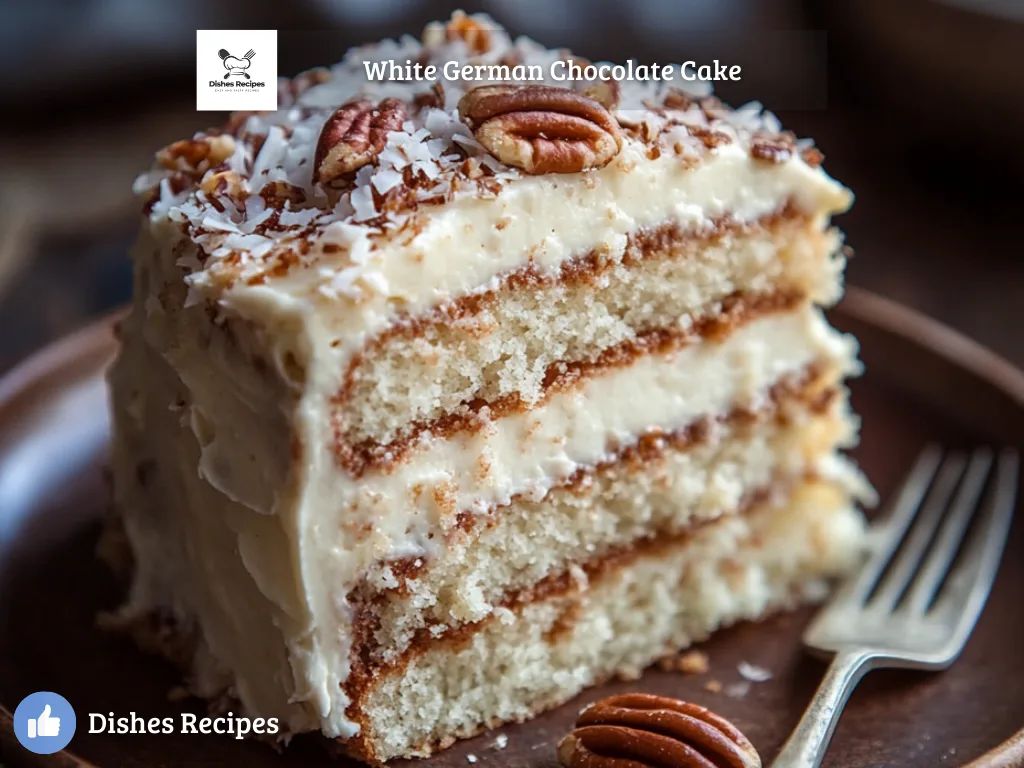 Discover the luxurious White German Chocolate Cake, featuring creamy white chocolate, rich coconut, and crunchy pecans. A decadent dessert experience awaits!